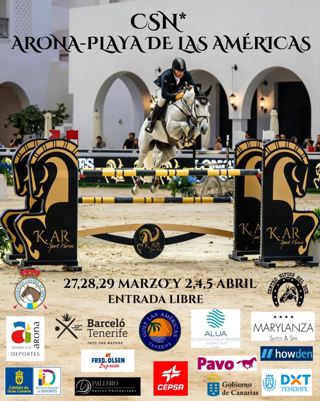 El municipio de Arona se prepara para acoger los próximos 27, 28 y 29 de marzo el CSN Arona–Playa de Las Américas de categoría una estrella, una destacada cita del calendario hípico que reunirá a deportistas en las instalaciones de Buzanada, consolidando a Tenerife como referente en la organización de competiciones ecuestres.